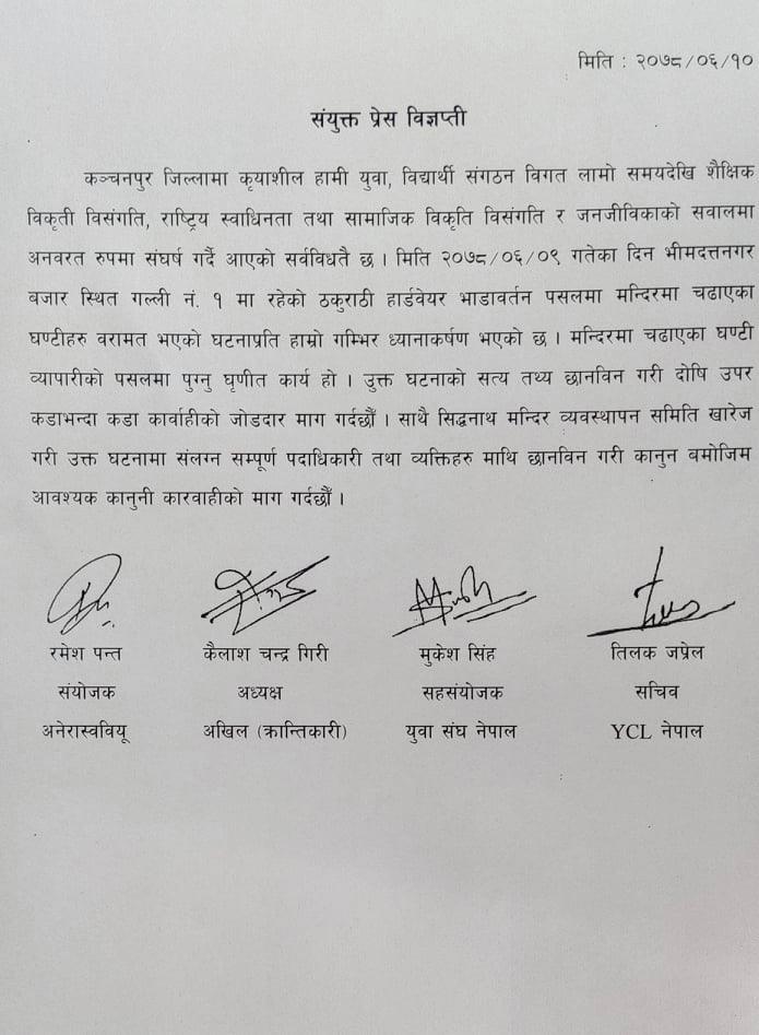 कञ्चनपुर: युवा विद्यार्थी संगठन कञ्चनपुरका विद्यार्थी र युवा संघ संगठनले विभिन्न आस्थावान व्यक्तित्वहरुमा मन्दिरमा चढाईएका घाटघण्टी व्यापारीको पसलमा पुग्नु घृणित कार्य भएको बताएका छन । चार विद्यार्थी–युवा संघ संगठनले आइतबार संयुक्त प्रेस विज्ञप्ती जारी गर्दै मन्दिरमा चढाईएका घाटघण्टी व्यापारीको पसलमा पुग्नु घृणित कार्य भएको बताएका हुन ।