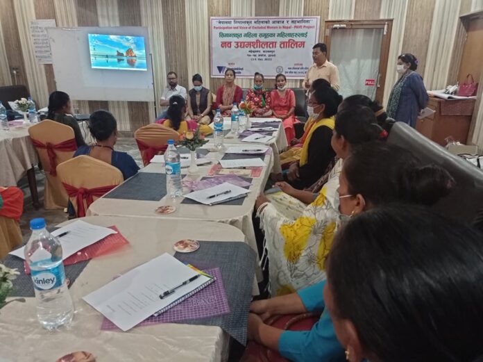 महेन्द्रनगर: सिमान्तकृत महिला समुहका महिलाहरुलाई तिन दिने नव उद्यमशिलता तालिम आईतबार महेन्द्रनगरमा सुरु भएको छ । सिमान्तकृत महिला समुहका एकल महिलाहरुलाई उद्यमी बन्न उनिहरुको क्षमता पहिचान गर्ने, पहिचान गरेको उद्यम ब्यावस्था बारे भन्न सक्ने, श्रोतको माध्यमबाट ब्यावसायिक बिचार संकलन गर्ने, आफु अनुकुल र उपर्युक्त ब्यावसाय छनौट गर्ने र ब्यावसायिक योजना निर्माण गर्ने गराउने उद्धेश्यले तालिमको आयोजना गरिएको नेपालमा सिमान्तकृत महिलाको सहभागिता र आवाज परियोजनाका जिल्ला कार्यक्रम संयोजक बिर बहादुर नेपाली ले बताउनु भयो ।
