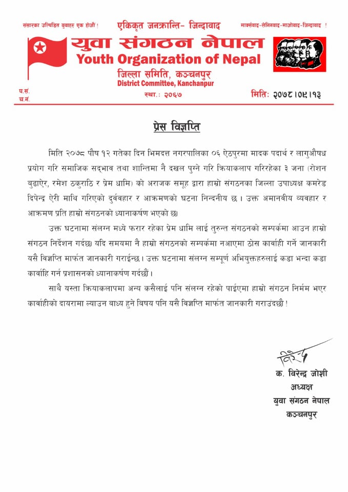 कञ्चनपुर : नेकपा माओवादी केन्द्र निकट अखिल क्रान्तिकारीले सुदूरपश्चिम विश्वविद्यालयले बेथिति नरोके चरणबद्ध आन्दोलन गर्ने चेतावनी दिएको छ । अखिल क्रान्तिकारी सुप विश्वविद्यालय राष्ट्रिय कमिटिले विश्वविद्यालयले बेथिति नरोके चरणबद्ध आन्दोलनको चेतावनी दिएको हो ।