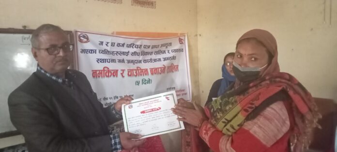 दोधारा । दोधारा चाँदनी नगरपालिकामा अपांगता भएकालाई ५ दिने नमकिन र चाउमिन बनाउने तालिम दिईएको छ् । दोधारा चाँदनी नगरपालिका कार्यालय महिला तथा बालबालिका शाखाको आयोजनामा ग र घ बर्गमा पर्ने अपांगता भएकालाई ५ दिने नमकिन र चाउमिन बनाउने तालिम सम्पन्न गरेको छ् । दोधारा चाँदनी नगरपालिकाका सबै वडालाई समेटेर ग र घ बर्गमा पर्ने आपांगता भएका महिला तथा पुरुषलाई उक्त तामलिममा समाबेस गरिएको दोधारा चाँदनी नगरपालिका कार्यालय महिला तथा बालबालिका शाखाले जनाएको छ् । नेपाल रेडक्रस सोसाईटी उपशाखा चाँदनीको सभा कक्षमा सम्पन्न भएको ग र घ बर्गमा पर्ने अपांगता भएकालाई ५ दिने नमकिन र चाउमिन तालिमको समापन सत्रका सभापति दोधारा चाँदनी नगरपालिका वडा नं. ३ का वडा अध्यक्ष पुष्कर दत्त जोशी रहेका थिए भने अतिथीमा दोधारा चाँदनी नगरपालिका कार्यपालिका सदस्य बिरमा बुढाथोकी, तालिमका प्रशिक्षकद्धय उद्धव सिंह कार्की र हिरा देबि कार्की रहेका थिए । कार्यक्रम संचालन दोधारा चाँदनी नगरपालिका महिला तथा बालबालिका शाखाका सहजकर्ता ईश्वरी सिंहले गरेका थिए ।