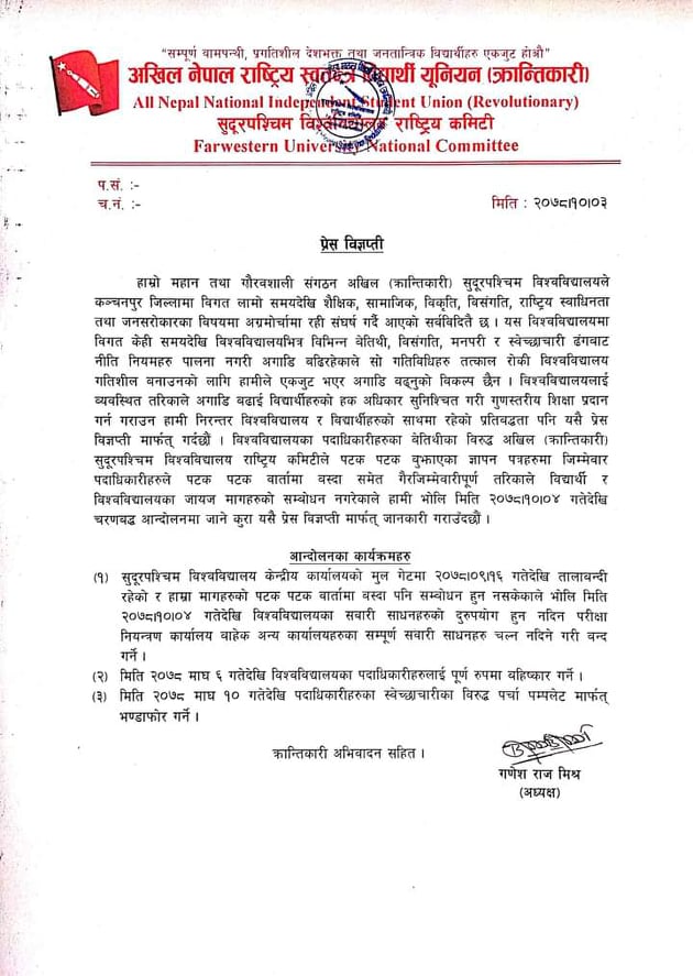 कञ्चनपुर: सुदूरपश्चिम विश्वविद्यालयका बेथिति बिरुद्धमा आन्दोलनरत अखिल क्रान्तिकारीले फेरी आन्दोलनका कार्यक्रम घोषणा गरेको छ । अखिल क्रान्तिकारी सुदूरपश्चिम विश्वविद्यालय राष्ट्रिय कमिटीले सोमबार विश्वविद्यालयका बेथिति बिरुद्धमा आन्दोलनका कार्यक्रम घोषणा गरेको हो । अखिल क्रान्तिकारी सुप विश्वविद्यालय राष्ट्रिय कमिटीका अध्यक्ष गणेशराज मिश्रले हस्ताक्षर गरेको विज्ञप्तीमा माघ ४ देखि १० गतेसम्म आन्दोलनका कार्यक्रम घोषणा गरिएका छन ।