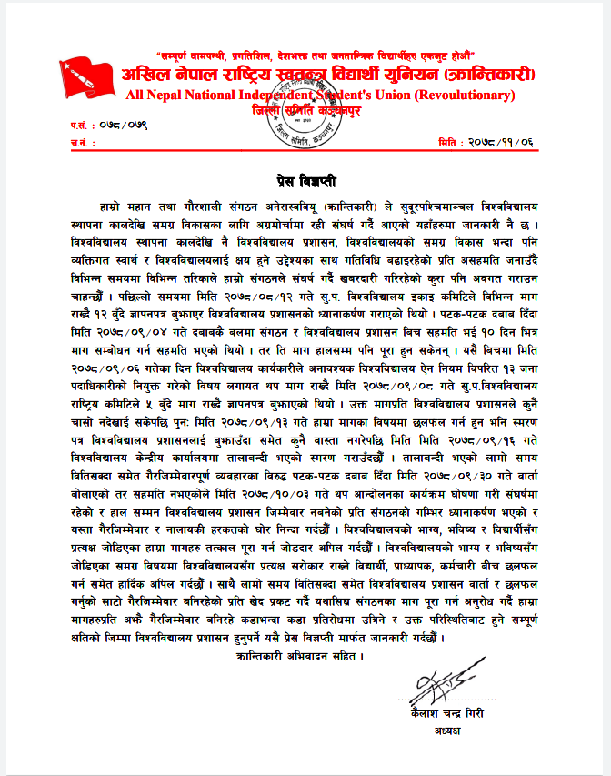 कञ्चनपुर : अखिल क्रान्तिकारीले सुदूरपश्चिम विश्वविद्यालयका बेथिति बिरुद्धमा ताकेता गर्दा समेत पदाधिकारीले गैर जिम्मेबारी र नालायकीपन देखाएको भन्दै भत्र्सना र निन्दा प्रकट गरेको छ । विश्वविद्यालय पदाधिकारीले विभिन्न समयमा गरिरहेको गैर कानुनी गतिबिधी बिरुद्धमा क्रान्तिकारीले तोकेता गर्दा पनि फेरी फेरी विश्वविद्यालयले गल्ती नसच्याउने र दोहो¥याउँदै आएकोप्रति आपत्ति जनाएको छ । अखिल क्रान्तिकारी कञ्चनपुरले शुक्रबार एक प्रेस विज्ञप्ती जारी गर्दै विभिन्न समयमा क्रान्तिकारी र विश्वविद्यालय विच भएका सहमती कार्यान्वयन गर्नुको साटो एकपछि अर्को गल्ती गरेर विश्वविद्यालय धरासायी बनाउन खोजेको आरोप लगाएको छ ।