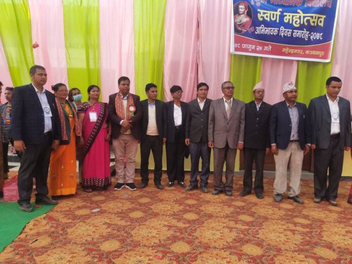 कञ्चनपुर: कञ्चनपुरको भृकुटी माध्यामिक विद्यालयले ५० औँ बर्ष शैक्षिक यात्रा पुरा गरेर स्वर्णजयन्ती मनाएको छ । मंगलबार एक कार्यक्रमका विच विद्यालयले स्वर्णजयन्ती तथा अभिभावक दिवस मनाएको हो । भीमदत्त नगरका प्रमुख सुरेन्द्र विष्टले स्वर्णजयन्तीको भृकुटीको सालिकमा अनावरण गर्दै सामुदायिक विद्यालयको सुधारका लागि नगरपालिकाका तर्फबाट सक्दो सहयोग गर्ने प्रतिबद्धता जनाए । मेयर विष्टले सामुदायिक विद्यालयको स्तर बृद्धिका लागि नगरबाट शैक्षिक योजना लागु हुने बताए । कार्यक्रमका बिशिष्ठ अथिति भीमदत्त नगरपालिका प्रमुख प्रशासकीय अधिकृत पुष्कर भट्ट, नगर शिक्षा प्रमुख हरिदत्त जोशी, पुर्व शिक्षा अधिकारी देवीदत्त भट्ट, भीमदत्त नगरपालिका ४ का वडाध्यक्ष लक्ष्मीदत्त बोहराले भृकुटी विद्यालयको शैक्षिक स्तर बृद्धिका जोडदिदै आ–आफ्नो तर्फबाट सहयोग गर्ने प्रण गरेका छन ।