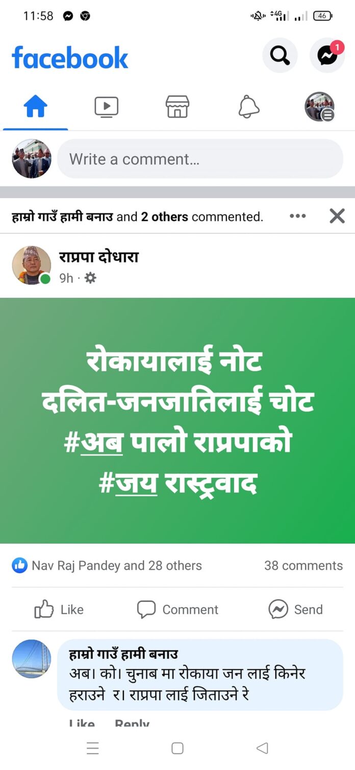 दोधारा । सामाजिक संजालमा केन्द्रिय नेताको फोटो राखेर कमेन्ट गर्ने माथी राष्ट्रिय प्रजातन्त्र पार्टी दोधारा चाँदनीले आपत्ती जनाउदै प्रहरीमा उजुरी दिएको छ् । आउदो बैशाख ३० गते हुने स्थानिय निर्वाचनलाई लक्षित गर्दै सामाजिक संजाल फेसबुकमा आफ्नो केन्द्रीय नेता राजेन्द्र लिङदेल सहित चुनाव चिन्ह प्रयोग गरि अनाहकमा स्टाट्स तथा कमेन्ट गर्दै आएको ‘राप्रपा दोधारा’ नामक फेसबुक पेज संचालन गर्ने ब्यक्ती तथा समुहलाई कार्वाहीको लागी माँग गर्दै ईलाका प्रहरी कार्यालय दोधारा चाँदनीमा उजुरी दिएको राष्ट्रिय प्रजातन्त्र पार्टी प्रदेश सदस्य तमान सिंह गुरुङ्गले जानकारी दिएका छन् ।