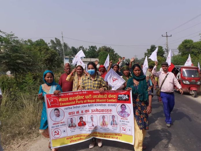 कञ्चनपुर:आशन्न बैशाख ३० गते हुने स्थानीय तहको निर्वाचनका लागि नेकपा माओवादी केन्द्र बेलौरी नगर स्तरिय निर्वाचन परिचालन कमिटिले उम्मेदवार सहित घरदैलो अभियान संचालन गरेको छ ।