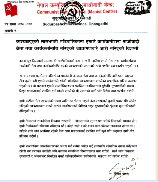 माओवादी केन्द्र सुदूरपश्चिम प्रदेशले एक प्रेस विज्ञप्ती जारी गर्दै लालझाडीमा एमाले नेता कार्यकर्ताको गत्था समुहले माओवादी केन्द्रका उम्मेदवारमाथि गुण्डागर्दी शैलीमा उत्रिएको जनाएको हो । माओवादीले बिनवारीमा एमालेका तीन दर्जन बढी लठैतहरुले स्थानीय तहको निर्वाचनमा नेकपा (माओवादी) केन्द्रबाट वडा नं. १ अध्यक्षका उम्मेदवार दिनेश रानामाथि गरेको सांघातिक हमलाको नेकपा (माओवादी केन्द्र) कञ्चनपुर घोर बिरोध तथा भत्र्सना गरेको छ ।