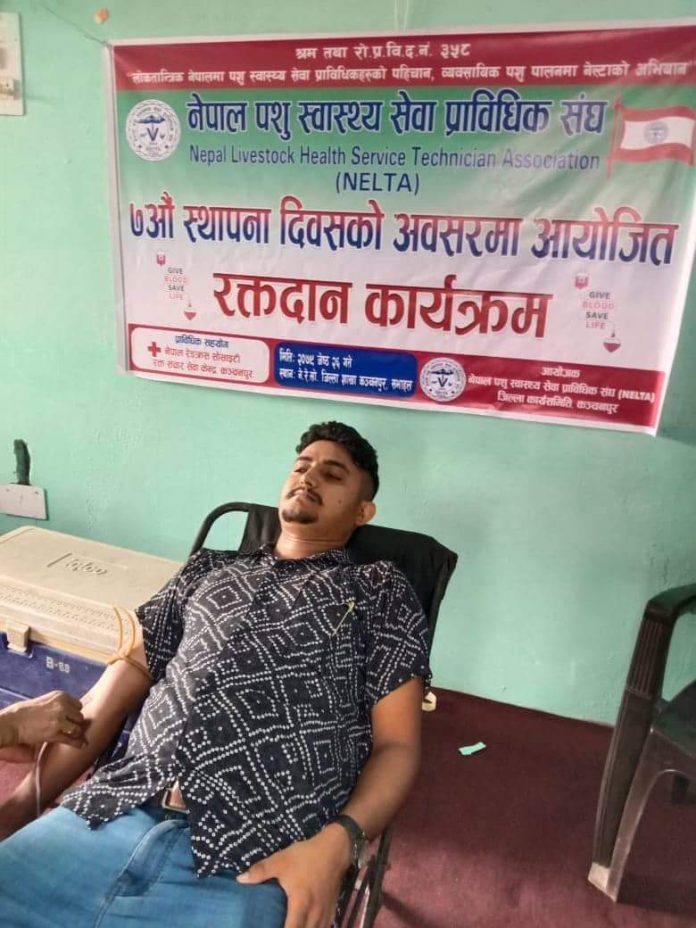 कञ्चनपुर : नेपाल पशु स्वास्थ्य प्राबिधिक संघ (नेल्टा) ले आफ्नो ७ औं स्थापना दिवसको अवसरमा रक्तदान गरेको छ।