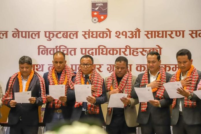 काठमाडौ : अखिल नेपाल फुटबल संघ (एन्फा)को नवनिर्वाचित कार्यसमितिको शपथ ग्रहण सम्पन्न भएको छ । शपथ ग्रहण सातदोबाटोस्थित एन्फा मुख्यालयमा भएको हो ।