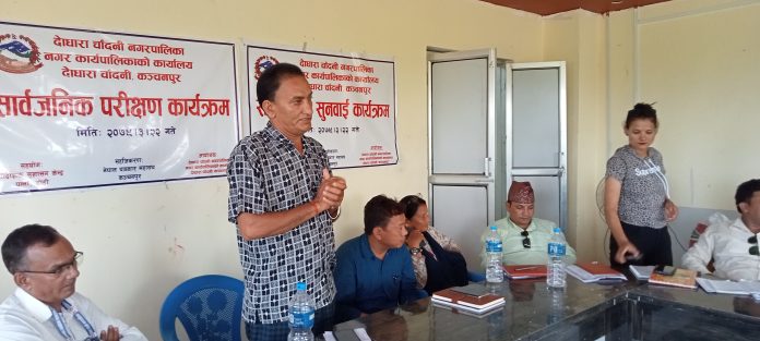 दोधारा । दोधारा चाँदनी नगरपालिका कार्यालयको आयोजना, नेपाल पत्रकार महासंघ कञ्चनपुरको सहजिकरण तथा प्रादेशिक केन्द्र पुन्ना, डोटीको सहयोगमा दोधारा चाँदनी नगरपालिका कार्यालयको सभा कक्षमा ‘सार्बजनिक सुनुवाई कार्यक्रम’ सम्पन्न भएको छ् । नेपाल पत्रकार महासंघ कञ्चनपुरका सभापती माधव धामीको सभापतित्वमा संचालन भएको सार्वजनिक सुनुवाई कार्यक्रमका प्रमुख अतिथी दोधारा चाँदनी नगरपालिकाका मेयर किशोर कुमार लिम्बु, बिशिष्ठ अतिथीमा दोधारा चाँदनी नगरपालिकाका उपमेयर गंगा जोशी रहेका थिए । कार्यक्रममा दोधारा चाँदनी नगरपालिकाका वडा अध्यक्षहरु बिक्रम चन्द, पदम रावल, हरसिंह धनाडी, भक्त बहादुर सुनार, केशव खत्री, ओंम बस्नेत, ओंम प्रकाश रोकाया, गोपिलाल कडेंल, दोधारा चाँदनी नगपालिका कार्यालयका प्रमुख प्रशासकिय अधिकृत गणेश मिश्र, कार्यपालिका सदस्यहरु, स्थानिय उपभोक्ताहरुको उपस्थिती रहेको थियो । कार्यक्रममा नगरपालिकाले शिक्षा, स्वास्थ्य, खाद्य र आवासको आधारभूत आवश्यकतालाई व्यवस्थित गर्नुपर्ने सहभागीलेहरुले धारणा राखेका थिए ।