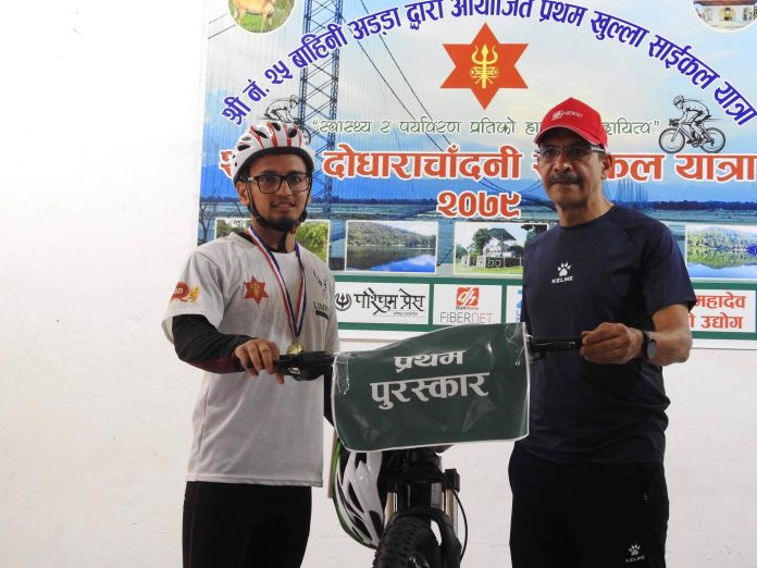 महेन्द्रनगर : स्वास्थ्य र प्रर्यावरणप्रतिको हाम्रो दायित्व भन्ने मुल नाराका साथ नेपाली सेनाले आयोजना गरेको ‘शुक्ला दोधारा चादँनी’ साइकल यात्रामा महेन्द्रनगरका भुवन विष्ट प्रथम भएका छन् । कञ्चनपुरको महेन्द्रनगरमा शनिबार नेपाली सेनाको श्री नं. २५ बाहिनी अड्डा भगतपुर ब्यारेकले आयोजना गरेको साइकल यात्रामा एक घण्टा ४४ मिनेट ५१ सेकेण्डमा निर्धारित ४२ किलोमिटर दुरी पार गर्दै विष्ट प्रथम भएका हुन । साइकल यात्रा सकिएपछि यहाँस्थित रुद्रध्वज गण मझगाउँ ब्यारेकमा आयोजित कार्यक्रममा नेपाली सेनाको पश्चिम कमाण्डका सेनापति उपरथी हिरालाल जोशीले साइकल यात्रामा बिजेताहरुलाई साइकल, प्रमाणपत्रसहित पुरस्कृत गर्नुभयो ।