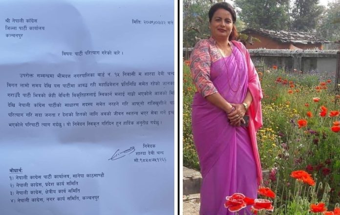कञ्चनपुर : महिला अधिकारकर्मी शारदा चन्दले नेपाली काँग्रेस पाटी परित्याग गरेकी छिन । लामो समयदेखि काँग्रेसमा आबद्ध रहेकी चन्दले पाटी परित्याग गरेको घोषणा गरेकी छिन । आर्थिक बर्ष २०७८/०७९को अन्तिम दिन असार ३२(शनिबार) एक प्रेस विज्ञप्ती जारी गर्दै चन्दले पाटी परित्याग गरेकी हुन । पाटी महाधिवेशन प्रतिनिधी रहेकी अधिकारकर्मी चन्दले पाटी भित्रको बेथिति विकृतीलाई स्वीकार गर्न नसकेका कारण पाटी परित्याग गरेको जनाएकी छिन । चन्दले साधारण सदस्य समेत नरहनेगरी राजिखुसीले पाटी परित्याग गरेकी हुन । चन्दद्वारा हस्ताक्षरित गरिएको विज्ञप्तीमा जनता र देशको लागि अवको जिवन स्वतन्त्र भएर काम गर्ने बताएकी छिन । पाटी भित्रको कस्तो, कुन प्रकृतिको आन्तरिक बेथिति विकृती बारे चन्दले विज्ञप्तीमा खुलाईएको छैन ।
