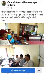 दोधारा । दोधारा चाँदनी नगरपालिकाले अबका दिन देखि सामाजिक सुरक्षा भत्ता नगरको टोल टोलबाट वितरण गर्ने भएको छ् । दोधारा चाँदनी नगरपालिकाका नगरप्रमुख किशोर कुमार लिम्बुको पहलमा अब देखि टोल टोलमा सामाजिक सुरक्षा भत्ता बितरण गरिने भएको हो । अझै सम्म बैंक मार्फत भत्ता बितरण गरिरहदा दिन भर गर्मी तथा चिसोमा बैकमा लामो लाईन बस्नु पर्ने र वृद्ध–वृद्वाहरुबाट यसबारे गुनासोहरु आएकोले यसको सहजताको लागि मेयर लिम्बूले बैंक संग छलफल अघि बढाएका हुन् । नगरपालिकाको कार्यालयमा मेयर किशोर कमार लिम्बु र बैंकका प्रतिनिधिहरु संगको छलफल पछि अबका दिन देखि सामाजिक सुरक्षा भत्ता टोल–टोलमा गएर वितरण गरिने मेयर लिम्बूको सचिवालयले जनाएको छ् । ‘सम्पूर्ण नगरवासीमा अब बितरण हुने सामाजिक सुरक्षा भत्ता टोल टोल बाट बितरण हुने हुदा , यहाँहरु सबैलाई जानकारीका साथ साथै सहयोगको निम्ती हार्दिक अनुरोध गर्दछौं’ दोधारा चाँदनी नगरपालिका नगर प्रमुख किशोर कुमार लिम्बुको सचिवालयमा उल्लेख छ् ।