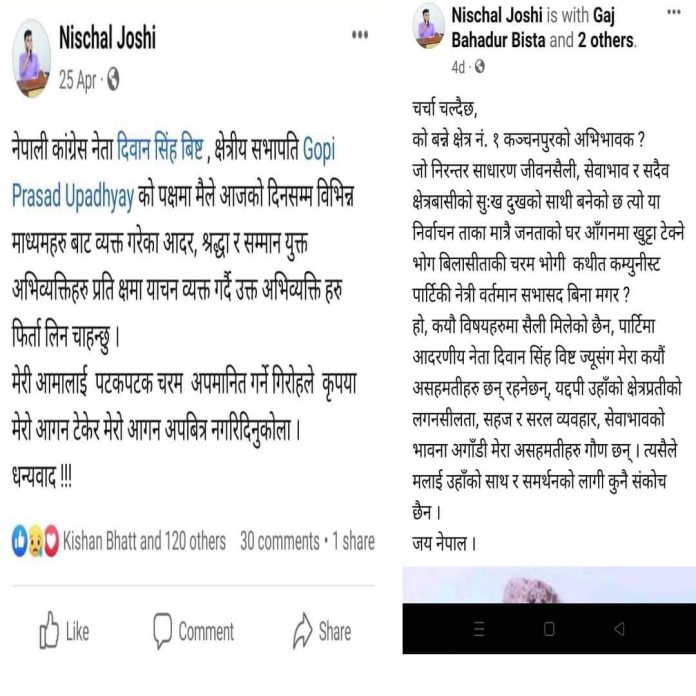 कञ्चनपुर: नेपाली काँग्रेस बेलडाँडीका युवा नेता गोकर्ण प्रशाद जोशी उफ्र निश्चिल जोशीले आफ्नै पार्टीका नेताप्रति दोहोरो चरित्र देखाएका छन ।