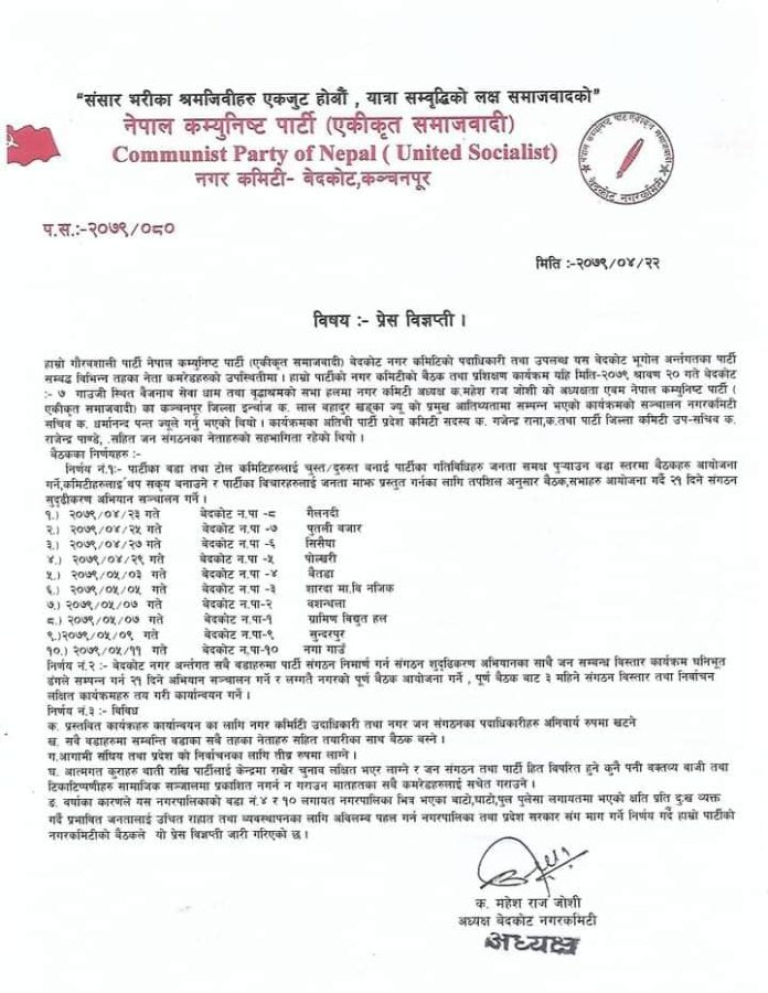 नेकपा एकीकृत समाजवादी बेदकोट नगरका अध्यक्ष महेशराज जोशीले नगरमा २१ दिने संगठन सुदृढीकरण अभियान संचालन भएको बताए ।