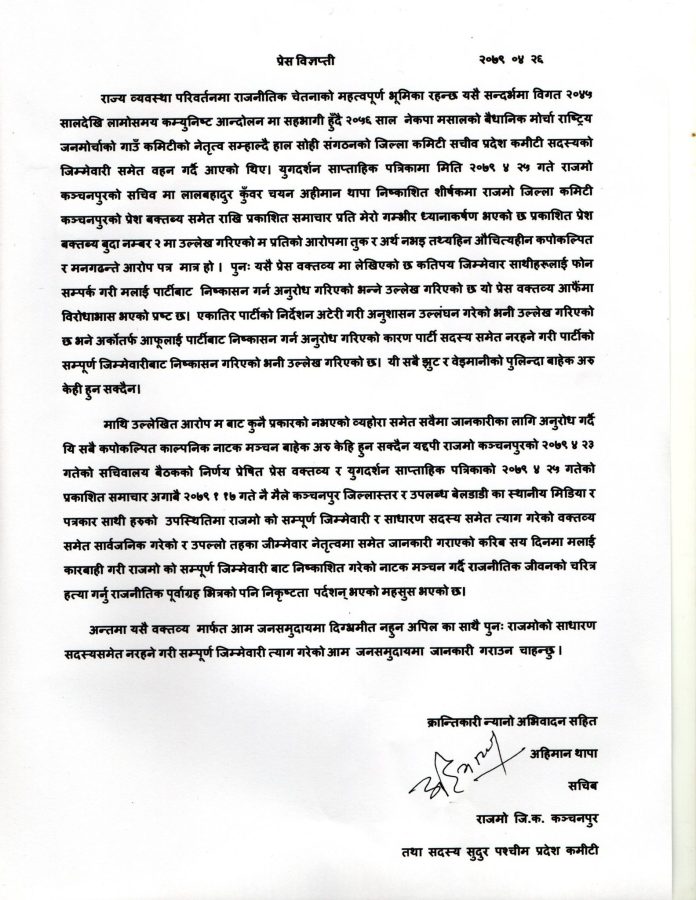 बिहीबार थापाले एक प्रेस नोट जारी गर्दै राजनीतिक पूर्वाग्राहीका साथै राजनीतिक जिवनको हत्या गर्न खोजिएको बताएका छन । जनमोर्चाको सम्पूर्ण जिम्मेबारी निष्कासित गरेको नाटक मञ्चन गर्दै राजनीतिक जिवनको चरित्र हत्या गर्नु पूर्वाग्रही भित्रको पनि निकृष्ठातापुर्ण काम भएको थापाको भनाई छ । ०४५सालदेखि निरन्तर कम्युनिष्ट पार्टीकोसदस्य भई जनताको काममा खटिएका बेला आफुमाथि गरिएको राजनीतिक बेईजतीको खेद प्रकट गरेका छन । जनमोर्चा कञ्चनपुरका सचिव थापाद्वारा हस्ताक्षरित गरिएको विज्ञप्तीमा साधारण सदस्य समेत नरहनेगरी पाटी परित्याग गरेको जानकारी गराएका छन ।