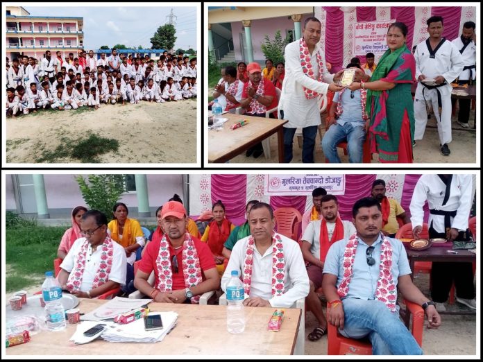 जुनियर खेलाडीहरुको ग्रेडिङ्ग कार्यक्रम अन्र्तगत उनीहरुको सेतो बेल्ट बाट रातो बेल्ट सम्म उनीहरुको खेल प्रस्तुतीको आधारमा श्रेणी पदोन्ती भएको जिल्ला सचिव गोबिन्द थापाले बताउनु भयो । सोही कार्यक्रममा नवनिर्वाचित वडा अध्यक्ष टेक राज पाण्डेय, सदस्य चित्र बहादुर रावल, शान्ति देवी नेपाली, सिता बोकटी र परमदेव रानालाई दोसल्ला ओडाएर तथा मायाको चिनो दिएर सम्मान गरिएको छ । सम्मान कार्यक्रममा वडा अध्यक्ष पाण्डेयले ‘खेलकुदले राष्ट्रको नामलाई विश्वसामु चिनाउने र स्वास्थ्य रहनको लागि पनि खेलकुद अति आवश्यक रहेकोले सबैले केही समय खेलकुदको लागि पनि दिनु पर्ने’ बताए । उनले भने ‘ बालबालिकाको सर्वाङ्गिण विकासको लागि आफुले कुनै कसर नछोडने र खेलकुद विकासको लागि गुलरिया तेक्वान्दो डोजाङ्गलाई खेलकुद सामग्री उपलब्ध गराउने छु ।’ त्यसै गरी कार्यक्रमका अध्यक्ष तथा कञ्चनजङ्गा मा.वि.का प्राचार्य पदम बहादुर ऐरले ‘हरेक व्यक्तिको जिवनमा खेलकुद महत्वपुर्ण भएकोले सबैले खेलकुदलाई निरन्तरता दिनु पर्ने अहिले हुने विभिन्न किसिमका रोग बाट लड्न सबै भन्दा राम्रो खेलकुद र व्ययाम हुने हुनाले सबैले खेलकुद र व्ययाम गर्नुपर्नेमा जोड दिनु भयो ।’ साथै खेलकुदको लागि आगामी दिनमा पनि खेलमैदान उपलब्ध गराउनुका साथै खेल सामग्री पनि उपलब्ध गराउने बाचा गर्नु भयो ।