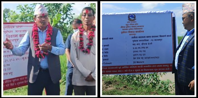 कञ्चनपुर: कञ्चनपुरको दक्षिणी क्षेत्रमा एकैदिन ६ योजनाको शिलान्यास गरिएको छ । जिल्लाको क्षेत्र नम्बर १ अन्र्तरगत रहेका बेलडाँडी, बेलौरी र पुर्नवासका विभिन्न गाँउबस्तीमा पुल र सडकका योजनाको शिलान्यास गरिएको हो । सुदूरपश्चिम प्रदेश सरकार भौतिक पूर्वाधार मन्त्रालय अन्तरगत चालु आर्थिक बर्ष २०७९/०८० मा पूर्वाधार विकास कार्यालय कञ्चनपुर मार्फत संचालित हुने पुल र सडकका योजनाको शिलान्यास गरिएको छ । पूर्वाधार विकास कार्यालय कञ्चनपुरका सुचना अधिकारी ईन्जिनियर हेमराज भट्टले ठेक्का सम्झौता भईसकेका ३ सडक र ३ पुलका योजना कार्यान्वयनका लागि शिलान्यास गरिएको बताए । बुधबार एकैदिन भौतिक पूर्वाधार राज्यमन्ी कुलबिर चौधरी र पुर्व आर्थिक मामिला तथा प्रदेश सभा सदस्य तारालामा तामाङ्गले स्थानीय जनप्रतिनिधीको उपस्थितिमा योजनाको शिलान्यास गरेका छन ।