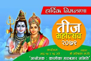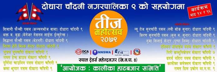 सामाजिक सदभाव र भातृत्वलाई कायम राख्नको लागी यस पटक पनि तिज पर्वको उपलक्ष्यमा बिगतका दिनहरु भन्दा फरक खाले सामाजिक सदभावलाई झल्काउने तिज बिशेष कार्यक्रम संचालन गर्न थालिएको कालिका हाँट बजार ब्यवस्थापन समितिका संयोजक रोशन रावलले जनाएका छन् । ‘तिज महोत्सव–२०७९’ को तायरी पुरा भएको आयोजक संस्थाले जनाएको छ् । कार्यक्रम आउदो १४ गते देखि १६ गते सम्म संचालन हुने बताईएको छ् । डिसीए नेपाल, नेपाल राष्ट्रिय समाज कल्याण संघ (एनएनएसडब्लुए), माईती नेपाल, दोधारा चाँदनी नगरपालिका कार्यालय, रुपाल ट्रडर्स लगाएतको संस्थाहरुले ‘तिज महोत्सव–२०७९’ लाई सघाएको छ् ।