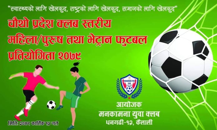 खेलकुद क्षेत्रको बिकास र खेलाडी उत्पादनको लागि प्रदेशको नमुना मुखी मनकामना युवा क्लब धनगढी उपमहानगरपालिका वडा न.१२ जुगेडाले ” स्वास्थ्यको लागि खेलकुद ,राष्ट्रको लागि खेलकुद ,समाजको लागि खेलकुद” भन्ने मुल नाराका साथ कार्तिक १५ गते देखि चौथो प्रदेश क्लब स्तरीय महिला / पुरुष तथा भेट्रान फुटबल प्रतियोगिता २०७९ को आयोजना हुने मनकामना युवा क्लबका अध्यक्ष कृष्ण राज पाण्डेले बताउनु भयो।