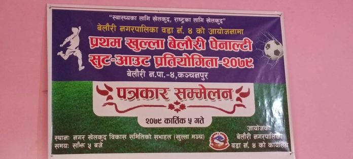 कञ्चनपुर: बेलौरीमा आइतबार हुने एक दिवसीय पेनाल्टी सुट–आउट प्रतियोगिताको तयारी पूरा भएको आयोजकले जनाएको छ । “स्वास्थ्यका लागि खेलकुद, राष्ट्रका लागि खेलकुद” भन्ने मूल नारा सहित बेलौरी नगरपालिका वडा नम्बर ४ को आयोजनामा यही कात्तिक ६ गते आइतबार अपराह्न ४ बजेदेखि रातिसम्मै हुने प्रथम खुल्ला बेलौरी पेनाल्टी सुट–आउट प्रतियोगिता हुन लागेको हो ।