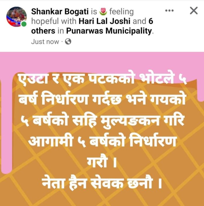कञ्चनपुर : पुनर्वास नगरपालिका कर्मचारी शकर बोगटी एमालेको प्रचारप्रसार गरिरहेका छन । पुनर्वास नगरका योजना अधिकृत समेत रहेका बोगटीले आफ्नो पदिय दायित्व गरिमा लत्याउँदै एमालेको पं्रचारप्रसार गरिरहेका छन ।