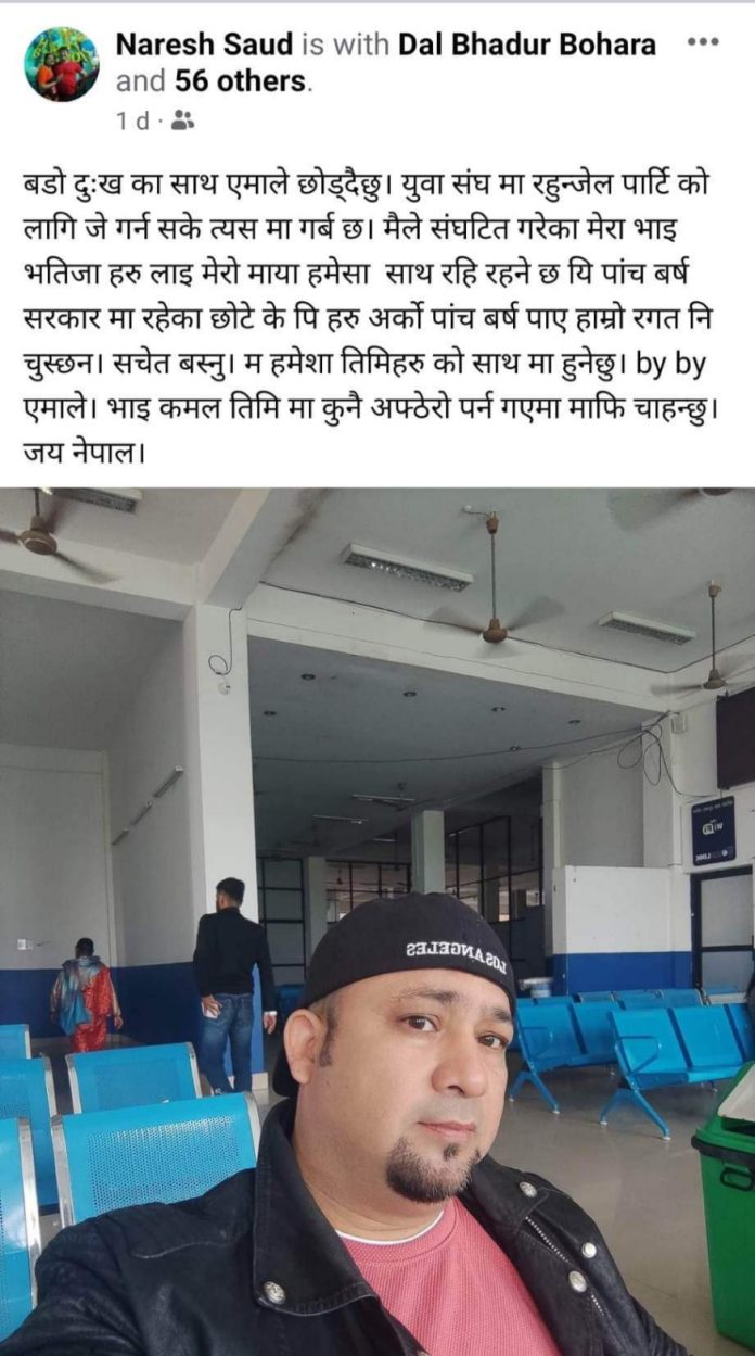 आफुले संगठित गरेका भाई भतिजाप्रति समेरा साथ रहने जनाएका छन । पाँच बर्ष सरकारमा रहेका छोटे केपीहरुको अर्को पाँच बर्ष पाए हाम्रो रगत नै चुस्छन, सचेत भएर बस्नु म हमेसा मितिहरुमो साथमा हुने छु, बाईबाई एमाले भाई कमल मितिमा तिमिमा अप्ठेरो पर्न गए माफि चाहन्छु भन्दै जय नेपाल भनेका छन । यसरी एमाले युवा नेताहरु पाटी परित्याग गर्दै धमाधम एमाले छाड्न थालेका छन । यस अघि एमाले परित्याग गरेका नेता कार्यकर्ताहरुले पाटीमा अवसरवादीहरुलाई टिकट दिएको भन्दै क्षेत्र १ र २का पुराना नेता कार्यकर्ता बागीदेखि पाटी परित्याग गर्र्दै आएका छन ।