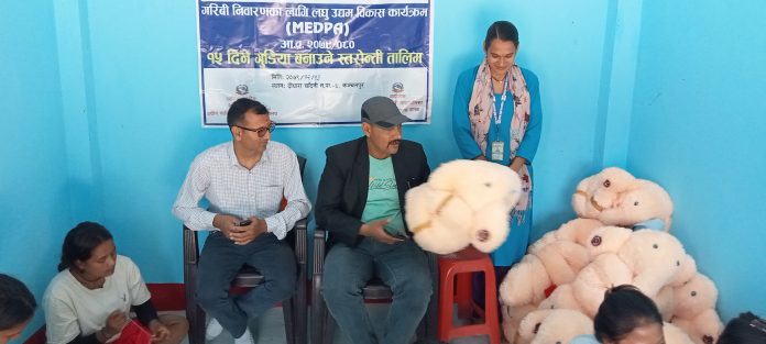 दोधारा । दोधारा चाँदनी नगरपालिकामा किशोरी तथा महिलाहरुलाई १५ दिने गुडिया बनाउने स्तरउन्नती तालिम संचालन भईरहेको छ् । नेपाल सरकार उधोग बाणिज्य तथा आपुर्ती मन्त्रालयको सहयोग तथा दोधारा चाँदनी नगरपालिका कार्यालयको लघु उद्यम बिकास शाखा कार्यालयको आयोजनामा वडा नं. ६ मा १५ दिने गुडिया बनाउने स्तरउन्नती तालिम संचालन भईरहेको दोधारा चाँदनी नगरपालिका– ६ का वडाध्यक्ष तथा नगर प्रबक्ता ओंम बस्नेतले जानकारी दिनुभएको छ् । यस्ता तालिमहरुले बाल बिकास, अधिकार तथा मनोरञ्जनको पक्षमा काम गरि सहयोग गर्ने अनि अन्यलाई तालीमको अवसर प्रदान गरि सामाजिक बिकासमा बिशेष भुमिका निभाउने कार्य गर्ने दोधारा चाँदनी नगरपालिका– ६ का वडाध्यक्ष तथा नगर प्रबक्ता ओंम बस्नेतले बताउनुभएको छ् ।