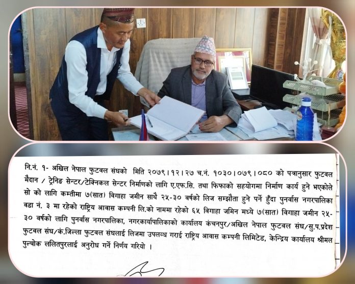 कञ्चनपुर : कञ्चनपुरको दक्षिणी भेगमा प्रदेश स्तरिय फुटवल मैदान निर्माणका लागि प्रराम्भीक गृहकार्यको शुभारम्भ भएको छ। अखिल नेपाल फुटबल संघ (एन्फा)ले विश्व फुटबल महासंघ (फिफा) अन्तरगत सुदूरपश्चिम प्रदेशका लागि फुटबल ट्रेनिङ सेन्टर निर्माण गर्ने प्रस्ताव राखे पछि सुदूरपश्चिम प्रदेश फुटबल संघ र अखिल नेपाल फुटबल सघका पदाधिकारीहरु यतिखेर जुर्मुराएका छन्। सुदुरपच्क्षिम प्रदेश फुटवल सघं का अध्यक्ष दिनेश श्रेष्ठ ज्यु को अगुवाई मा पुनर्वास नगरपालिका का नगर प्रमुख तोय प्रसाद शर्मा सङ्ग आज प्रादेशिक बहुउद्देश्यीय फुटबल ट्रेनिङ निर्माण सम्बन्धी छलफल गरिएको थियो। उक्त ट्रेनिङ सेन्टर करिब सात बिगाहा क्षेत्रफलमा फैलिने छ । निर्माणका लागि नगरपालिककाले आखिल नेपाल फुटबल संघ सग जग्गा उपलब्ध गराउने लिखित समझौता गर्नुपर्ने हुन्छ।  स्थानिय सरकारले करीब २० बर्ष देखि ३० बर्षका लागि जमिन लिजमा लिएको समझौता पत्र वा जमिनको स्थायित्व पत्र अखिल नेपाल फुटबल संघ लाई बुझाउँनु पर्ने छ। नगरपालिकाले उक्त जमिन अखिल नेपाल फुटबल संघ लाई बुझाउने तयारी भए पश्चात नगरपालिक र सघ बिच समझौता हुनेछ।