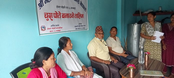 दोधारा । सधै घरायसी काम धन्दामा मात्र सीमीत रहने महिलाहरु इति बेला सीप सिकेर आत्मनिर्भर बन्नुपर्छ भन्ने कुरामा सचेत भएको पाईन्छ । कुनै समयमा पुरुषको आदेशमा चल्ने महिलाहरु अहिले आफैमा मेहेनत गरेर स्वरोजगार बन्न खोजिरहेका छन् । अवसर पाए महिलाहरुले पनि पुरुष सरह गर्न सक्छन् भन्ने उद्धेश्यले दोधारा चाँदनी नगरपालिका– ४ का महिलाहरुको लागि वडास्तरिय चुरा, पोते तालिम संचालनमा ल्याएको छ् । दोधारा चाँदनी नगरपालिका– ४ वडा कार्यालयको आर्थिक सहयोग र महाकाली महिला बिकास नेपाल दोधारा चाँदनीको आयोजनामा एक हप्ते चुरा, पोते बनाउने तालिम संचालन गरिएको छ् । यतिबेला महिलाहरुलाई आत्मनिर्भर र सक्षम बनाउन चुरा, पोते, माला तालिम संचालन गरिएको दोधारा चाँदनी नगरपालिका– ४ का वडाध्यक्ष भक्त बहादुर सुनारले जानकारी दिएका छन् । महिलाहरु आर्थिक रुपमा कमजोर हुदा पछाडी परेकाले तालिमको आयोजना गरिएको दोधारा चाँदनी नगरपालिका– ४ का वडाध्यक्ष भक्त बहादुर सुनारले बताएका छन् ।