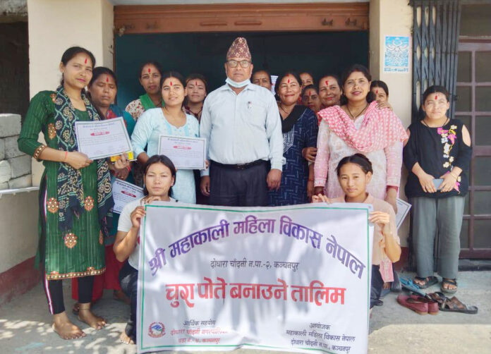 दोधारा । दोधारा चाँदनी नगरपालिकामा एक हप्तै चुरा पोते तालिम सम्पन्न भएको छ् । दोधारा चाँदनी नगरपालिका वडा नं. ४ को आयोजनामा महिलाहरुको लागी एक हप्ते चुरा पोते तालिम सम्पन्न भएको दोधारा चाँदनी नगरपालिका– ४ का वडाध्यक्ष भक्त बहादुर सुनारले जानकारी दिएका छन् । सधै घरायसी काम धन्दामा मात्र सीमीत रहने महिलाहरु खली बसेको बेला सीप सिकेर आत्मनिर्भर बन्नुपर्छ भन्ने उद्धेश्यले तालिम संचालन गरिएको वडाध्यक्ष सुनारले बताएका छन् ।
