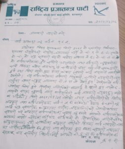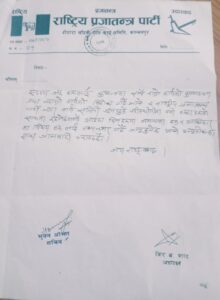 मिती २०७९/९/२८ गतेको नगर कार्य समितीको निर्णय अनुसार तहाँ कार्यपालिकामा वडा नं. ५ का वडाध्यक्ष केशव वहादुर खत्रीज्युलाई भद्र सहमतीका आधारमा पार्टीका जनप्रतिनिधी नेताकोरुपमा सहमती भए अनुसार कार्यपालीकाका सदस्यज्यू हरुले आफ्नो कार्यपालिकामा अन्यन्त्र भएको खण्डमा पार्टी बाट कार्यवाही को सिलसिला जारी रहनेछ् । अनुसासनमा रही सम्झौता अनुसार पार्टीको हितमा कार्य नभएको खण्डमा पार्टीका निश्वार्थ जनप्रतिनिधीद्धारा माँग गरिएका बुदाहरुमा नभएमा सरकार बाट समर्थन फिर्ता लिई आफ्नो राप्रपाका कार्यपालिका सदस्यहरुलाई सुझावका साथै राम्रो कार्यको मुल्याङकन तथा नराम्रो कार्यको विरोध गर्दै जाने र राष्ट्रीय प्रजातन्त्र पार्टी नगर कार्य समितीले जुनसुकै परिस्थीतीमा पनी हजुरहरुको साथमा रहने भन्दै आउदा दिनहरुमा जनताका हक अधिकारका बिषयहरुलाई मध्यनजर गर्दै जानुहुने छ भन्ने अनुरोधका अनुरोध का साथ जानकारी गराउदछौ ।’