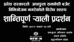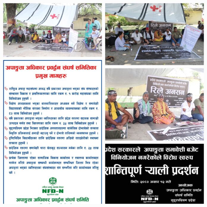 कञ्चनपुर: सुदूरपश्चिम प्रदेश सरकारले बजेटमा अपाङ्गताको क्षेत्रलाई बेवास्ता गरिएको भन्दै विभिन्न आन्दोलनका चरणहरु घोषणा गरिएका छन् ।