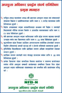 राष्ट्रिय अपाङ्ग महासंघमा आबद्ध सबै प्रकारका अपाङ्गता क्षेत्रमा क्रियाशील संघसंस्थाहरूको संस्थागत विकास र सशक्तीकरणका लागि रु. १ करोड रकम विनियोजन हुनुपर्ने, विशेष आवश्यकता भएका बालबालिकाहरू अध्ययन गर्ने विशेष र समावेशी विद्यालयको भौतिक संरचना निर्माण र आवासीय व्यवस्थापनका लागि रकम रु. ८० लाख विनियोजन हुनुपर्ने, सबै प्रकारका अपाङ्गता भएका व्यक्तिहरूका लागि प्रदेश स्तरमा सहायक सामाग्री उत्पादन मर्मत तथा वितरणका लागि रकम रु. ३५ लाख विनियोजन हुनुपर्ने, सुदूरपश्चिम प्रदेश भित्रका प्रादेशिक अस्पतालहरूमा साङ्केतिक दोभासेको तत्काल नियुक्ति प्रक्रियालाई अगाडि बढाउनु पर्ने र दोभासे तालिमको व्यवस्थापन हुनुपर्ने, दृष्टिविहीन विद्यार्थीहरूका लागि प्रादेशिक स्तरमा अडियो लाइब्रेरीको स्थापना तत्काल हुनुपर्ने, प्रादेशिक स्तरमा समावेशी पारा खेलकुद सञ्चालन गर्नका लागि रु. २५ लाख विनियोजन हुनुपर्ने, प्रत्येक जिल्लामा रहेका सामाजिक विकास कार्यालय र स्वास्थ्य कार्यालयहरू मार्फत गरिने अपाङ्गता सम्बन्धी कार्यक्रमहरु सम्बन्धित जिल्ला भित्र रहेका अपाङ्गता भएका व्यक्तिहरूका संघसंस्थाहरूसँग सम्झौता गरी कार्यान्वयन गरिनु पर्ने लगायतका गहरू अपाङ्गता अधिकार प्रवर्द्धन सङ्घर्ष समितिले अगाडि सारेको छ । मागहरू सम्बोधन नभए कडा संघर्षका कार्यक्रममा उत्रने अपाङ्गता अधिकार प्रवर्द्धन सङ्घर्ष समितिले जनाएको छ ।