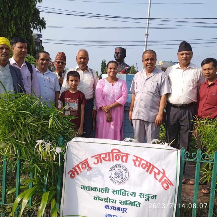 कञ्चनपुर : आज देश भर भानुजयन्ती धुमधामका साथ मनाईएको छ । सोही क्रममा आज कञ्चनपुरमा पनि मनाइएको हो । २१० औं भानुजयन्ती भीनपा ४ स्थित भानु चोकमा रहेको भानुभक्त्तको सालिकमा माल्यार्पण गरी त्यहाँ उपस्थित साहित्यकारहरुले आफ्ना विभिन्न लेख, रचना, कविता र गीत गाएर उनलाई सम्झेका थिए ।
