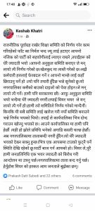 तपाईले कार्यपालिका भित्र द्धन्द्ध गराउन खोज्नु भएको छ् । आउने कार्यपालिकामा हामी पनि हेर्छौ । यही हो झोले प्रविधी भनेको अगाडी कसरी चल्छ हेर्छौ । अब नगरपालिकामा तालाबन्दी नगरी हुदैन् । यो धेरै ज्यादती भएको देख्न सक्नु हुन्छ् । भित्र एक आपसमा टाउको फुटनै पर्ने स्थिति देखि रहेको छु । पार्टी बाज गर्न आएको हो । पुरै हामी जनप्रतिनिधी एक भएर ज्यादतीको बिरोध गरी आन्दोलनमा उत्रनुपर्छ । नगरपालिकामा ताला बन्द गर्नु पर्छ् । हेर्नुहोस मेयरको हरकत आम जनताले बुझेका छन्’ दोधारा चाँदनी– ५ का वडाध्यक्ष केशब बहादुर खत्री आफ्नो सामाजिक संजालमा लेखेका छन् ।