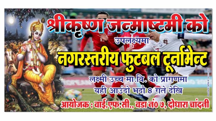 दोधारा । दोधारा चाँदनी नगरपालिकामा श्री कृष्ण जन्माष्टमीको उपलक्ष्यमा लक्ष्मी माबि दोधारामा फुटवल प्रतियोगिता संचालन हुने भएको छ् । युथ फुटवल क्लव दोधारा चाँदनीको आयोजनामा दोधारा चाँदनी नगरपालिका– ७ लक्ष्मी माबिमा आउदो ८ गते देखि नगर स्तरिय फुटवल प्रतियोगिता संचालन हुने भएको युथ फुटवल क्लव दोधारा चाँदनीका दिलु क्षेत्रीले जानकारी दिएका छन् ।
