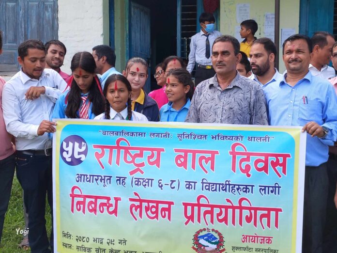 कञ्चनपुर : शुक्लाफाँटा नगरपालिकामा ५९ औँ राष्ट्रिय बाल दिवसको अवसरमा निबन्ध लेखन प्रतियोगिता सम्पन्न भएको छ । नगरपालिकाद्धारा आयोजित निबन्ध लेखन प्रतियोगितामा नगरभित्रका सामुदायिक तथा संस्थागत गरी २८ विद्यालयको सहभागिता रहेको थियो । प्रतियोगितामा प्रत्येक विद्यालयबाट आधारभूत तह कक्षा (६-८) का एक/एक जना विद्यार्थीको सहभागिता रहेको थियो । कृष्ण माध्यमिक विद्यालय झलारी (साविकको श्रोत केन्द्र भवन) मा बाल अधिकार संरक्षण विषयमा विद्यार्थीहरुले निबन्ध लेखका थिए ।