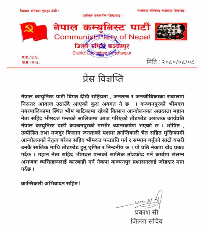 कञ्चनपुरको भीमदत्त नगरपालिकामा स्थित भीम बाटिकामा रहेको किसान आन्दोलनका अग्रदस्ता महान नेता सहिद भीमदत्त पन्तको सालिकमा आज गरिएको तोडफोड अराजक कार्यप्रति नेपाल कम्युनिस्ट पार्टी कञ्चनपुरको गम्भीर ध्यानाकर्षण भएको छ । शोषित , उत्पीडित तथा मजदुर किसान जनताको पक्षमा क्रान्तिकारी चेत सहित मुक्तिकामी आन्दोलनको नेतृत्व गरेका सहिद भीमदत्त पन्तलाई गर्व गर्नुको साटो यसरी उनकै सालिक माथि तोडफोड हुनु घृणित र निन्दनीय छ । यो प्रति नेकपा खेद प्रकट गर्दछ । महान नेता सहिद भीमदत्त पन्तको सालिक तोडफोड गर्ने कार्यमा संलग्न अराजकलाई कारबाही गर्न नेकपा कञ्चनपुर प्रशासनलाई जोडदार माग गर्दछ ।”