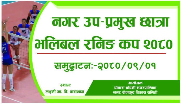 दोधारा । दोधारा चाँदनी नगरपालिकामा नगर उपप्रमुख छात्रा भलिवल प्रतियोगिता संचालन हुने भएको छ् । दोधारा चाँदनी नगरपालिका– ७ लक्ष्मी उच्च माबिको खेलमैदानमा भोलीबाट नगर उपप्रमुख छात्रा रनिङ्ग भलिवल प्रतियोगिता संचालन हुने भएको नगर खेलकुद बिकास समिति दोधारा चाँदनीका नगर अध्यक्ष दिवान चन्दले जानकारी दिएका छन् ।