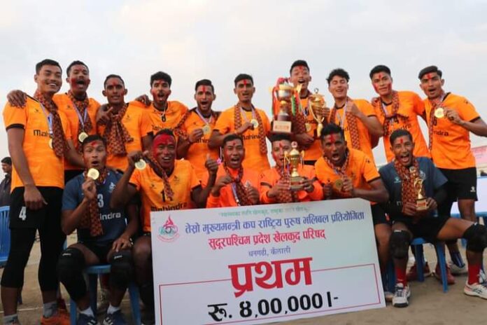 कञ्चनपुर : शनिबार कञ्चनपुरको महेन्द्रनगर खुला मञ्चमा सम्पन्न भएको तेस्रो मुख्यमन्त्री पुरुष राष्ट्रिय भलिबल प्रतियोगिताको उपाधी सशस्त्र प्रहरी बल नेपालको एपिएफ क्बललाई पाईयो ।