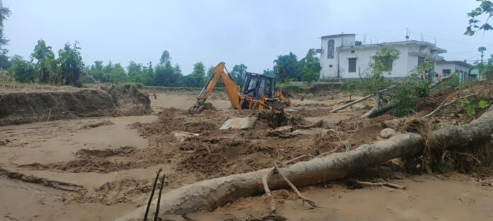 कञ्चनपुर : लगातार चारदिनदेखि कञ्चनपुरमा परेको भिषण बर्षाले जिल्लाभरी तहसनहस बनाईरहेका बेला सरदमुकाम नजिकैको एक गाँउमा समेत वितण्डा मच्चाएको छ । वाढीले बेदकोट नगरपालिका ९ सुन्दरपुर गाँउको आर्दश टोलमा उच्च कटानी गरेको छ । चुरे भएर बग्ने कनकट्टी खोला गाँउमा उल्टिएपछि स्थानीय किसानका खेतबारी कटानीदेखि घर भत्काईदिएको छ । सुन्दरपुर आर्दश टोलका स्थानीय दल बहादुर कुँवरले कनकट्टी खोलाको सतह बृद्धि भएर गाँउमा पसेको बताए । ‘चुरेबाट भीमदत्त भएर हाम्रो सुन्दरपुर गाँउ हुँदै चौधर नदीमा मिसिने कनकट्टी खोला आर्दश टोलबाट गाँउतिर उर्लियो, ‘उनले भने, ‘गाँउ पसेको खोलाले खेतबारी, कच्ची र पक्की सडक, घर सहितका सरचना तहसनहस गरिदियो ।’ कुँवरले आइतबार राती १२बजेतिर आफ्नो टोलमा रहेका तीन चार घरका स्थानीय सहित बस्तुभाउ राती नै सुरक्षित स्थानमा लगेको बताए । ‘खोला गाँउपसेपछि कटानी भएको थिएन, ‘उनले भने, ‘कम्मर भन्दा माथि नै पानी थियो, जब पानी घट्दै गयो, तब कटानी हुँदै गयो ।’