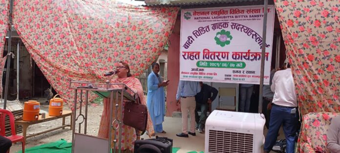 भने, बेलौरीका ४२ वाढी पीडितलाई त्रिपाल बाहेक अन्य खाद्यान समाग्री वितरण गरिएको छ । नेशनल लघुवित्त वित्तिय संस्था लिमिटेडका प्रमुख कार्यकारी अधिकृत यादवले विपद्, महामारीका बेला संस्थाबाट यसरी नै आफ्ना सदस्यहरुलाई अति आवश्यकीय बस्तु तथा खाद्यान्न समाग्री वितरण गर्दै आएको बताए । नेशनल लघुवित्त वित्तिय संस्था लिमिटेडका सुडा कञ्चनपुरका शाखा प्रमुख मिना रिजालले लघुवित्तिय संस्थामा आबद्ध रहेका समुहका ग्राहक सदस्य जो वाढी पीडित भए उनीहरुलाई संस्थाबाट समाजिक उत्तरदायित्व अन्र्तरगत सक्दो राहत वितरण गरिएको बताईन । ‘यो विपद्का बेला हामीले हाम्रा ग्राहक सदस्यहरुको पीडा मनन गर्दै स्थानीय, संघीय सरकारसग समन्वय गरेर पीडितलाई राहत वितरण गरेका छौँ, ‘उनले भनिन, ‘आगामी दिनमा पनि विपद्का बेला ग्राहकका लागि सक्दो सहयोग गछौँ ।’ नेशनल लघुवित्त वित्तिय संस्था लिमिटेड अत्तरिया कैलाली शाखा प्रमुख मनोज पण्डितले लघुवित्तबाट पीडितको घाउमा मलम लगाउने काम भएको बताए । उनले गत असार अन्तिम साता कैलाली, कञ्चनपुरमा आएको वाढीले पीडित भएका संस्थाका सदस्यहरुलाई केही दिनका लागि जिवनमा आईपर्ने समस्या टार्न राहत दिएको बताए ।