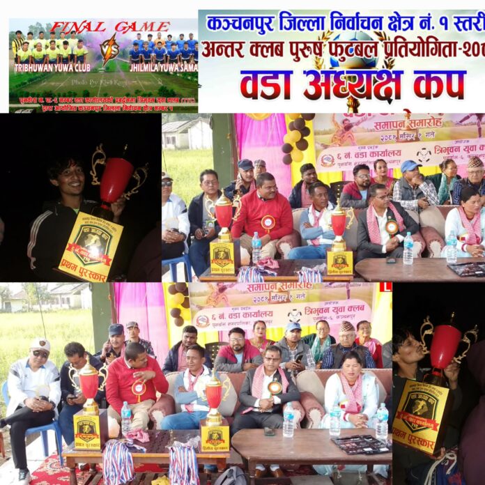 महेन्द्रनगर: कञ्चनपुर जिल्लाको दक्षिणी क्षेत्रमा निर्वाचन क्षेत्र नं. १ स्तरीय अन्तर क्लब पुरुष फुटबल प्रतियोगिता-२०८१ वडा अध्यक्ष कपको उपाधी झिलमिला युवा क्लब बेलडाँडिले जितेको छ।