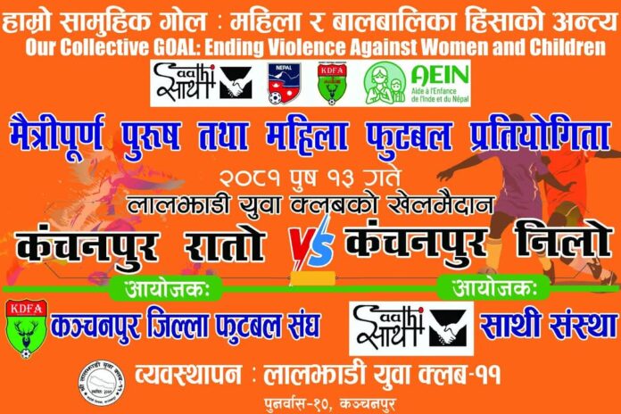कञ्चनपुर जिल्ला फुटबल संघ र साथी संस्थाको संयुक्त आयोजनामा र लालझाडी युवा क्लब-११ को व्यवस्थापनमा पौष १३ गते शनिवारका दिन दिउँसो १२ बजे लालझाडी-११ को खेलमैदान पुनर्वास -१० मा एक दिने मैत्रीपुर्ण पुरुष तथा महिला फुटवल प्रतियोगिताको आयोजना हुने कञ्चनपुर जिल्ला फुटबल संघका महासचिव नितेश रावलले बताए।