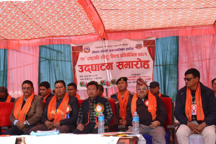 दोधारा चाँदनी नगरपालिका संचालन भएको ‘राष्ट्रपति रनिङ शिल्ड’ को सफलताको कामना राख्दै पूर्व भूमि व्यवस्था, कृषि तथा सहकारी राज्यमन्त्री मान बहादुर सुनारले दोधारा चाँदनी नगरपालिका क्षेत्रमा खेललाई अझ सशक्तरुपमा अगाडी बढाउन सबैको सहयोग र सहकार्यको आवश्यकता रहेको बताउनुभएको छ् । नगर खेलकूद विकास समितिका अध्यक्ष दिवान चन्दको अध्यक्षतामा संचालन गरिएको प्रतियोगिताको उद्धघाटन सत्रमा नेकपा एमाले दोधारा चाँदनीका इन्चार्ज गगन खत्री, वडाध्यक्ष पदम सिह रावल, दोधारा चाँदनी नगरपालिकाका निवर्तमान उप मेयर चिनी गिरी लगायतले शुभ कामना मन्तव्य राख्नुभएको थियो ।