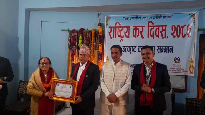 आन्तरिक राजस्व कार्यालय कञ्चनपुरका निमित्त प्रमुख विजय भुसालले गत आर्थिक बर्षमा सबैभन्दा बढी कर बुझाउने सहकारीलाई सम्मान गरिएको बताए । निमित्त प्रमुख कर अधिकृत भुसालले सबैभन्दा बढी सहकारीले २करोड, १५लाख, २३ हजार, १७५रुपैया कर बुझाएको बताए । पारिश्रमिक समाजिक सुरक्षा बाफत १५लाख, ७५ हजार ७६, बैठक भत्ता ९९हजार, ९सय, व्यक्तिगत, एकलौटी तथा प्रालि कर ४६ हजार, २सय ५०, ब्याज कर ७६लाख, २९हजार, १सय १, लाभान्स कर १८लाख, ३३हजार २सय ८,घर बहाल कर १लाख, ५६हजार ९सय ६, गत आर्थिक बर्ष ०८१/०८२को आय कर १करोड, १लाख, ६७ हजार, ९सय ६८रुपैया गरेर २करोड, १५ लाख, २३ हजार, १७५रुपैया रहेकोछ । कार्यक्रममा प्रमुख अथिति समेत रहेका निमित्त प्रमुख जिल्ला अधिकारी मोहन जोशीले सहकारीका अध्यक्ष नारा जोशीलाई प्रमाण पत्र पत्र हस्तान्तरण गरेका थिए ।