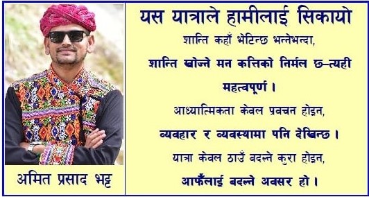 २०८२ साल अषाढमा भारत राजस्थान राज्यको माउण्ट आबुमा ओम शान्तिको असोजमा हुने सम्मेलनमा सहभागी हुन बेलौरी नगरपालिका वडा नं।६ निवासी दान सिंह रानाजिले विगत समेतमा गरेको अनुरोधलाई हृदयंगम गरी स्वीकार गरे । सोको तयारी शिलशिलामा ओम शान्ति आबद्ध राजकुमार भण्डारी सर कार्यालयमा आइ जाने विषयको टुंगो लगाइ आउदा जाँदा लाग्ने रकम मध्ये रेल टिकटका लागी चाहिने केही अग्रीम रकम सम्बद्ध कार्य गरी यात्राको औपचारिक प्रक्रिया थालनी भयो ।  अषाढको महिनामै असोजको तयारी,सुरुमा लामो अवधि लागेपनि पछि असोज महिनाको यात्रा समय आएको पत्तै लागेन ।  २०८२ असोज १९ गते बेलौरीबाट यात्रा प्रारम्भ हुन्छ भन्ने विषयको जानकारी पश्चात आवश्यक तयारी अगाडी बढ्यो । बेलौरीबाट बसमा भ्रमण टोली महेन्द्रनगर बसपार्क पुगि सक्दा म पनि भीमदत्त न।पा।७ हल्दुखाल स्थित घरबाट सोही ठाउँ पुगि सकेको थिए । बसपार्कमा पुग्दा केही परिचित,केही आंशिक परिचित व्यक्तिहरुसितको शिष्टाचार पश्चात महेन्द्रनगरबाट दिल्लीको यात्राका लागी पवनदुत यातायातको ना।७।ख १८६२ नम्बरको बसमा बसी अगाडी बढ्यौ ।
