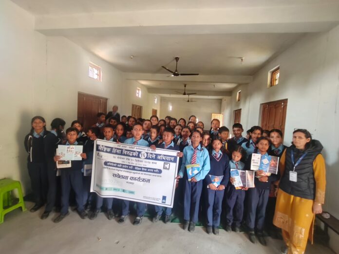 कञ्चनपुर : भीमदत्त नगरपालिका–११ गड्डाचौकीस्थित श्री सिद्धनाथ अमर माध्यमिक विद्यालयका कक्षा ६ र ७ मा अध्ययनरत ५५ जना विद्यार्थीलाई माइती नेपाल कञ्चनपुरले मानव बेचबिखन तथा लैङ्गिक हिंसा विरुद्ध अभिमुखीकरण कार्यक्रम सम्पन्न गरेको छ। ‘प्रविधिको सही प्रयोग गरौँ, लैङ्गिक हिंसा अन्त्य गरौँ’ भन्ने नारासहित सञ्चालन गरिएको कार्यक्रम लैङ्गिक हिंसा विरुद्धको १६ दिने अभियानको अवसरमा आयोजना गरिएको हो।