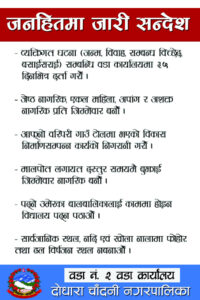 दोधारा । कञ्चनपुरको दोधारा चाँदनी नगरपालिकामा ३४ औं अन्तर्राष्ट्रिय अपांगता दिवसको अवसरमा अपांगता भएका ब्यक्तीहरुलाई सम्मान गरिएको छ् । ३४ औं अन्तर्राष्ट्रिय अपांगता दिवसको अवसरमा वडा कार्यालयको सिफरिस गरिएका तथा अपांगता भएर पनि सामाजमा आफुहरुले आत्मनिर्भर कार्यमा प्रयासरत २४ जना अपांगता भएकाहरुलाई सम्मान सहित प्रत्येक जनालाई नगद रु. १ हजारको दरले सम्मान धनरासी प्रदान गरिएको दोधारा चाँदनी नगरपालिका कार्यालय महिला तथा वालवालिका शाखाका शाखा प्रमुख डम्मरा पन्तले जानकारी दिनुभएको छ् ।