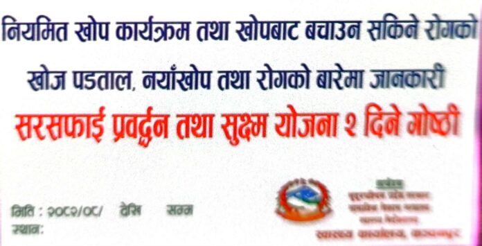 नियमित खाेप कार्यक्रम तथा खाेपबाट बचाउनु सकिने राेगकाे खाेज पडताल, नयाँ खाेप तथा राेगका बारेमा जानकारी दिन मंसिर २५ गतेबाट पाैष १ गते सम्म ६ दिन जिल्लाका सबैपलिकाका स्वास्थ्यकर्मीहरूसंग गाेष्ठि कार्यक्रम गरिएकाे स्वास्थ्य कार्यालय कञ्चनपुरका खाेप शाखा प्रमुख जनक बहादुर कुवँरले जानकारी दिनु भयाे ।